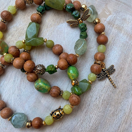 Self-care into Spring - Gemstones in beautiful shades of green featuring gold lady bug, dragon fly charm and wings and unfinished Bayong Wood for your essential oils