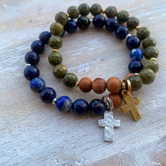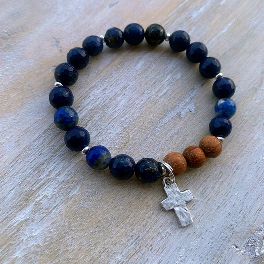 Silver Cross | Lapis Lazuli & Faceted Onyx with Bayong Wood Diffuser Bracelet