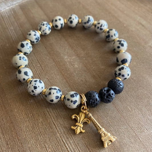 Paris | Dalmatian Jasper Diffuser Bracelet with Eiffel Tower & Fleur de Lis