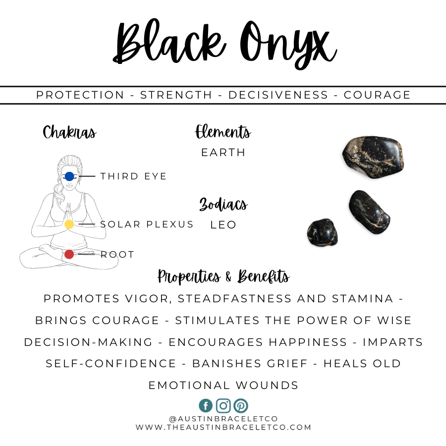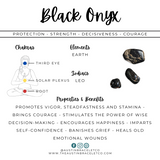 Black Onyx - Promotes vigor, steadfastness and stamina - Brings courage - Stimulates the power of wise decision-making - Encourages happiness - Imparts self-confidence - Banishes grief - Heals old emotional wounds