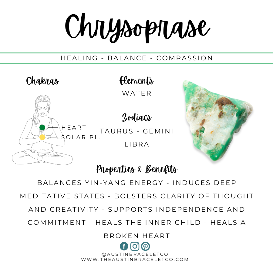 Chrysoprase balances Yin-Yang energy - induces deep meditative states - bolsters clarity of thought and creativity - supports independence and commitment - heals the inner child - heals a broken heart